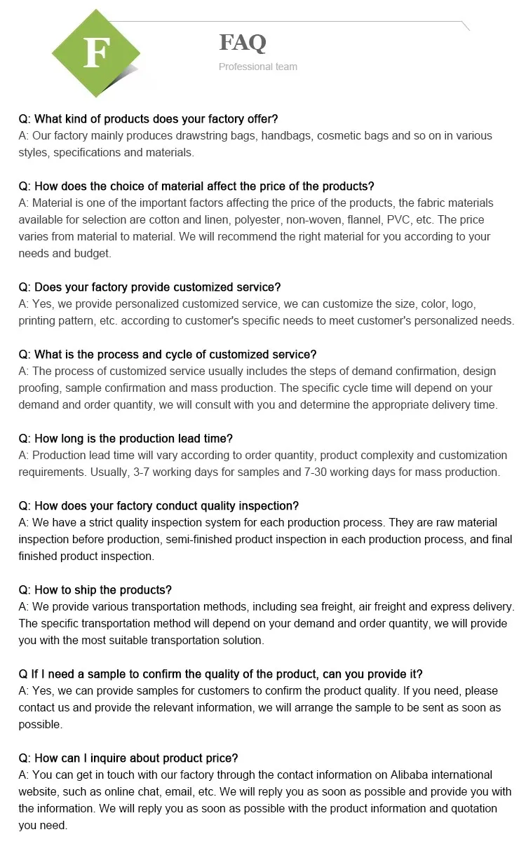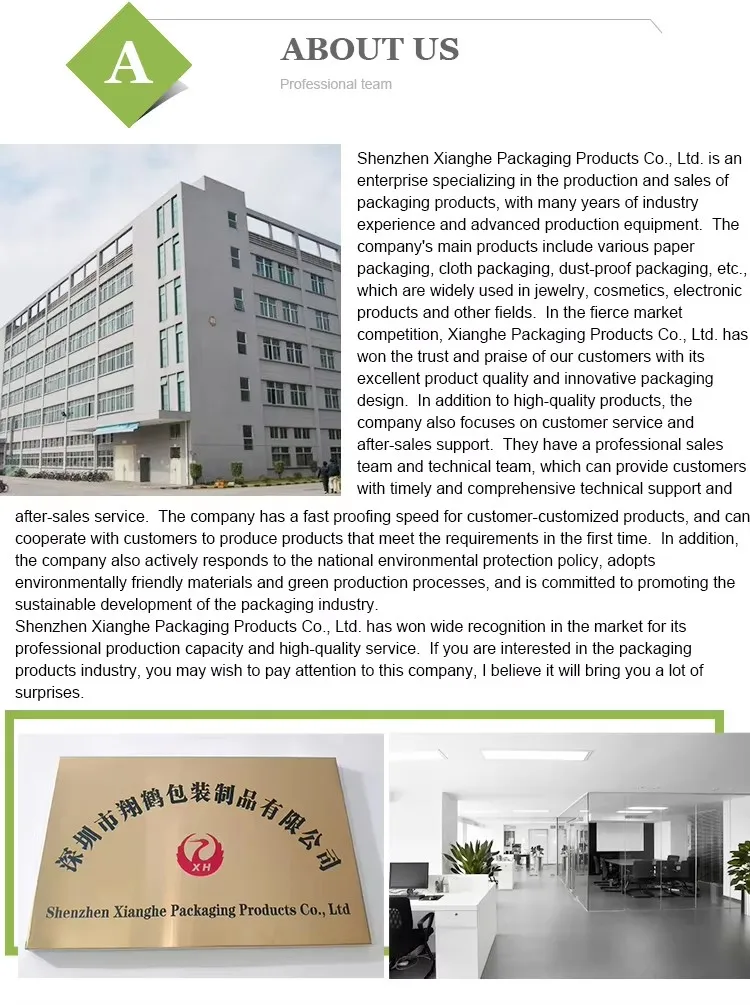 Shenzhen Xianghe Packaging Products Co.. Ltd.is anenterprise specializing in the production and sales ofpackaging products,with many years of industryexperience and advanced production equipment. Thecompany's main products include various paperpackaging,cloth packaging,dust-proof packaging, etc.which are widely used in jewelry,cosmetics, electronicproducts and other fields.In the fierce marketcompetition,Xianghe Packaging Products Co.. Ltd. haswon the trust and praise of our customers with itsexcellent product quality and innovatve packaqincdesign.In addition to high-quality products, thecompany also focuses on customer service andafter-sales support. They have a professional salesteam and technical team, which can provide customerswith timely and comprehensive technical support andafter-sales service. The company has a fast proofing speed for customer-customized products, and calcooperate with customers to produce products that meet the reauirements in the first time. in addition.the company also actively responds to the national environmental protection policy, adoptsenvironmentally friendly materials and green